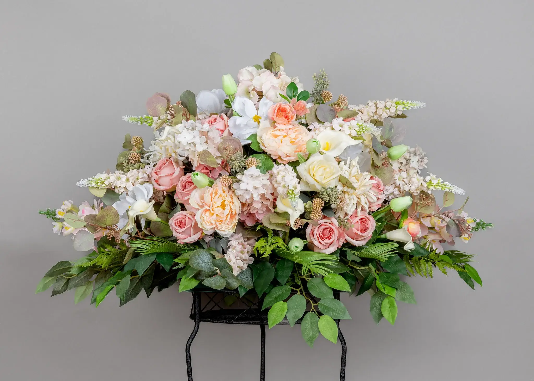 Hydrangea, roses, Asters, tulips, hyacinth, calla lilly.