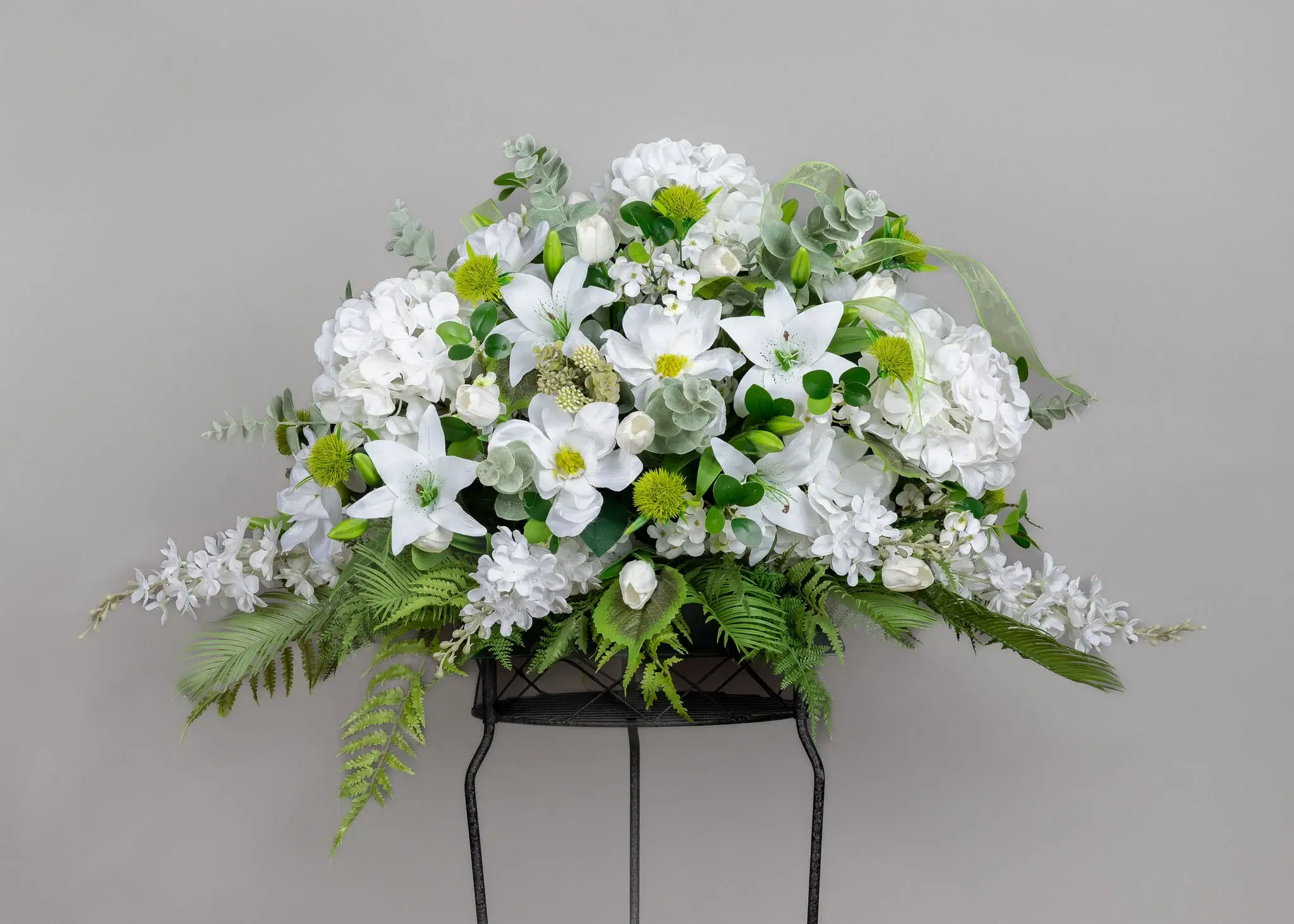 Full of flowers consisting of Hydrangeas, Tulips, Hyacinth, Daisys, Eucalyptus and Lime Green Ribbon.