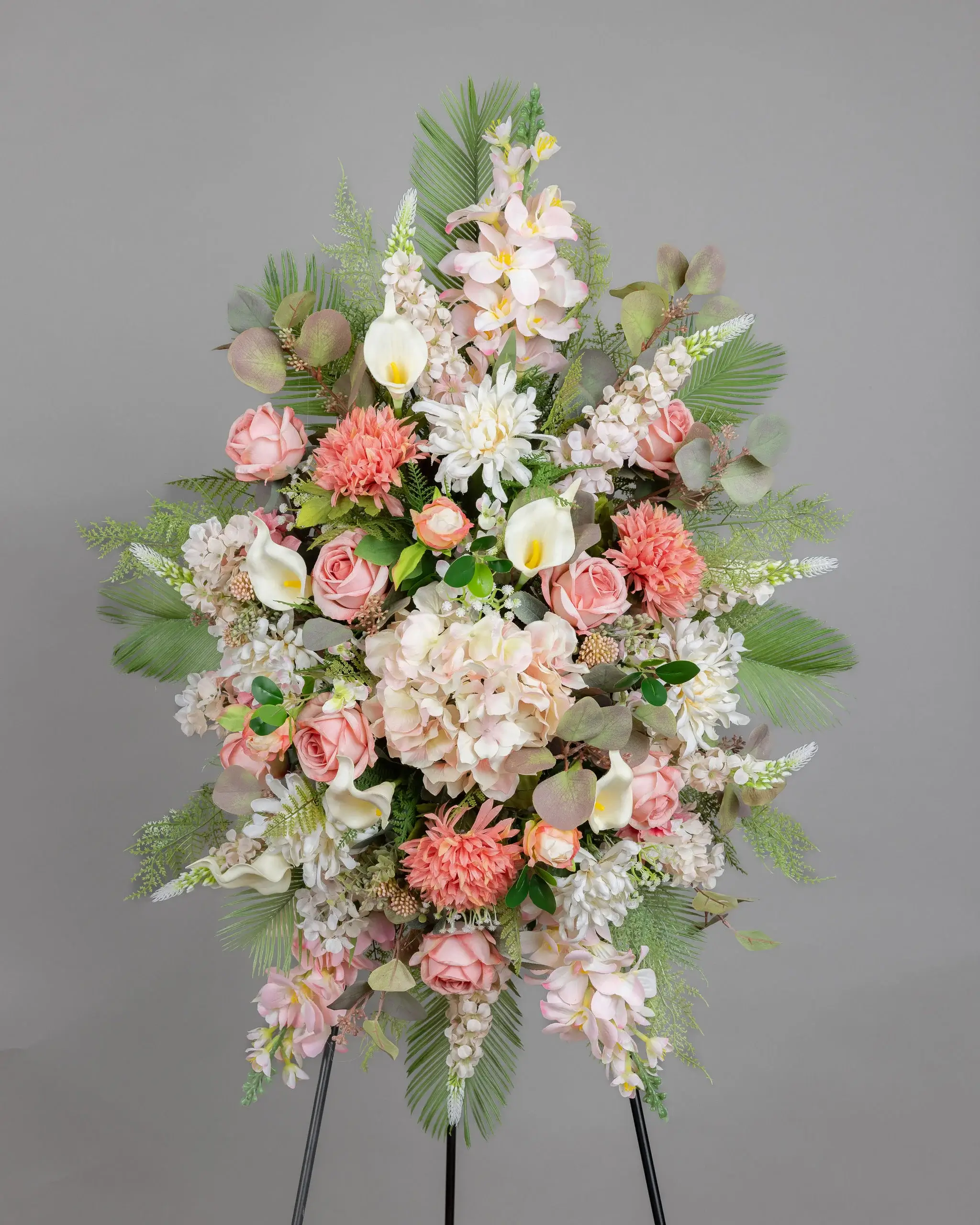 Hydrangea, roses, Asters, tulips, hyacinth, calla lilly.