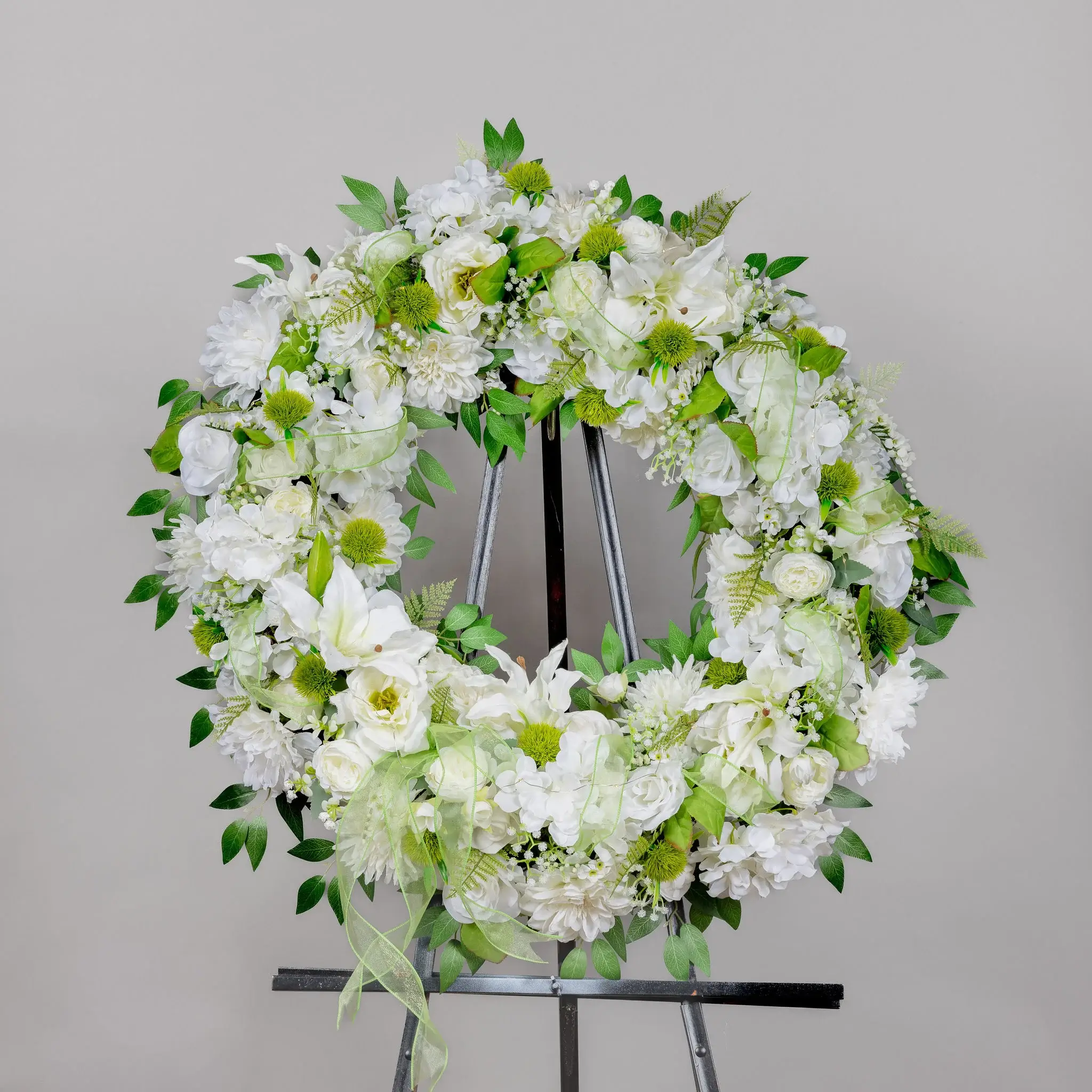 Full of Flowers consisting of Hydrangeas, Daisys, Roses, Babys Breath, Lime green Dandelions, Lime green ribbon with twinkling lights.